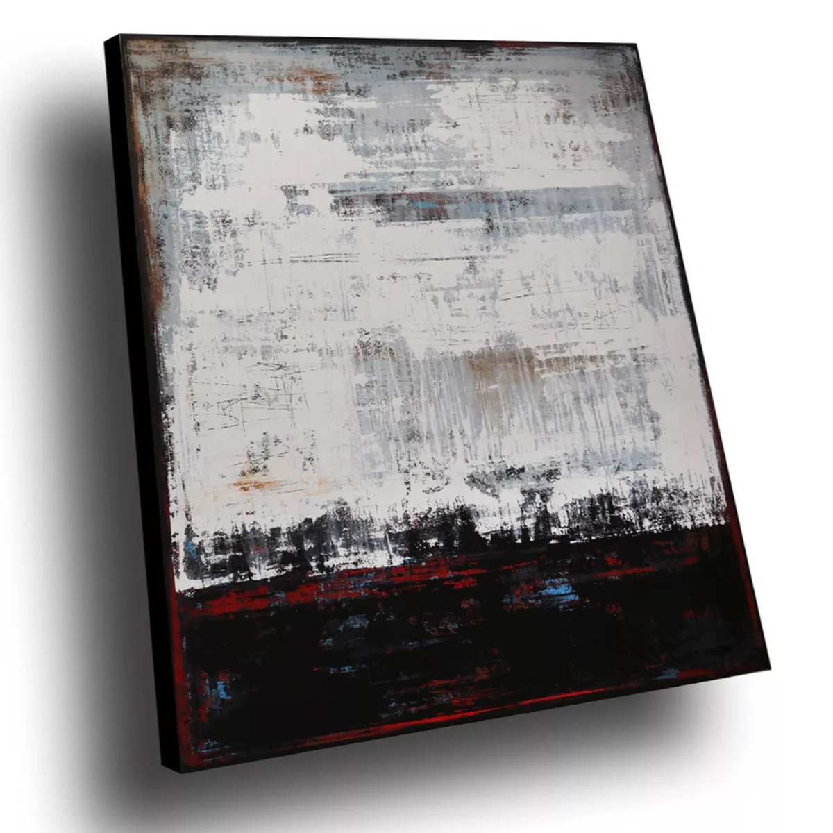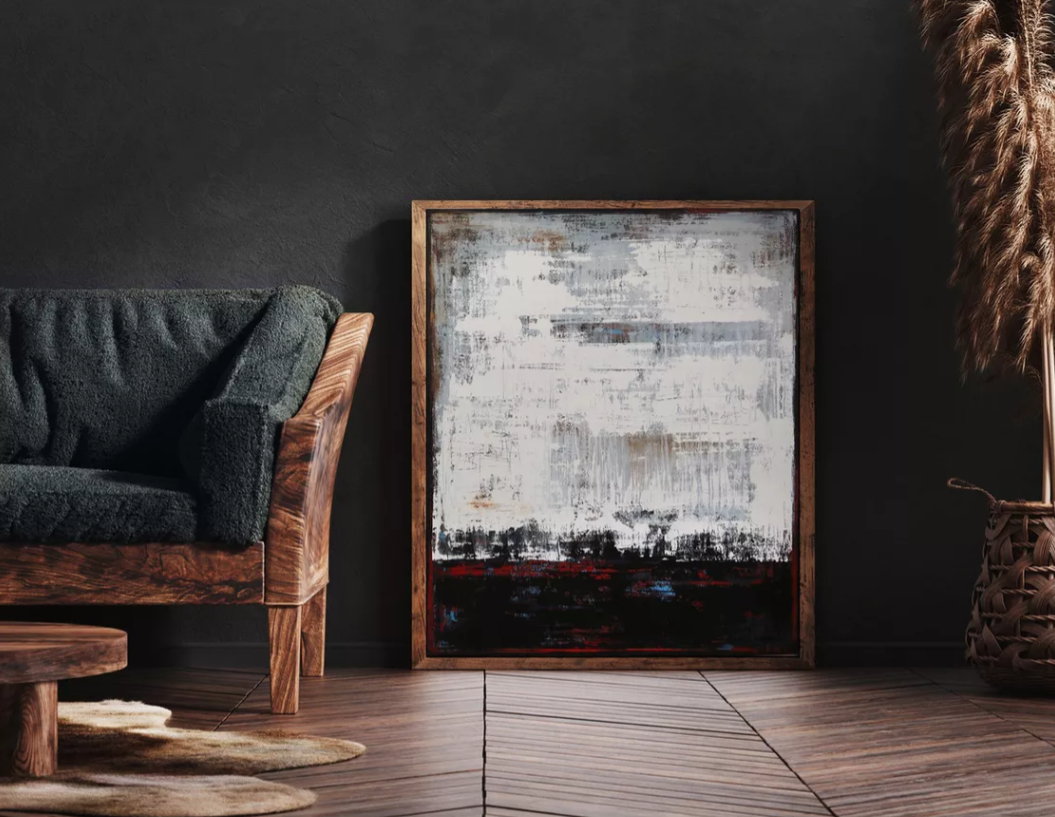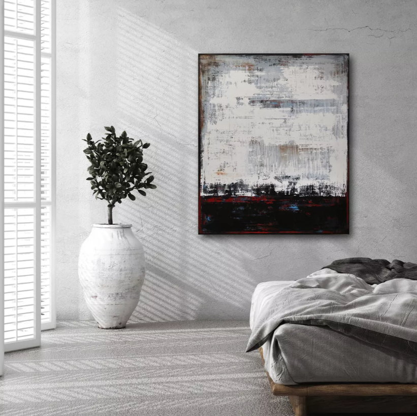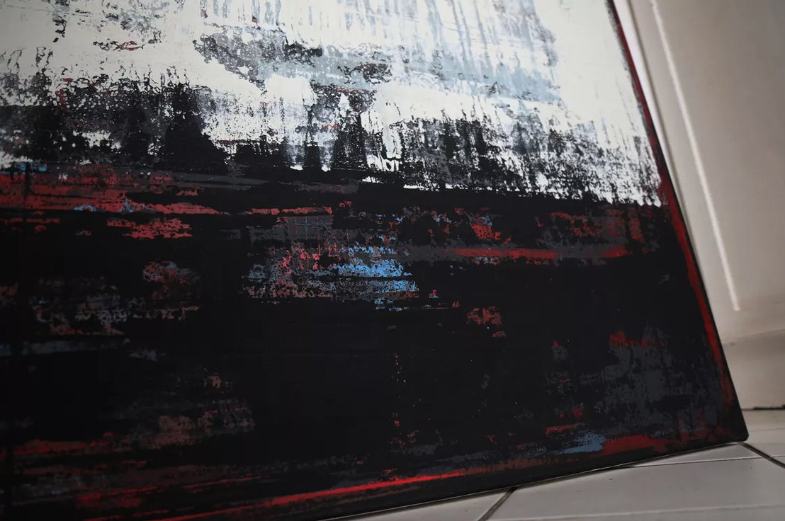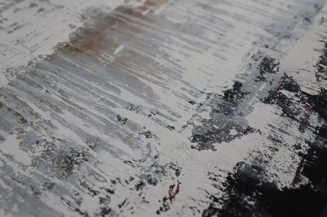 Die Faszination dieses Gemäldes liegt im Detail. Strukturen, Risse, Kratzer, mehrere Farbschichten und ein mattes Finish bewahren die Schönheit des Vergänglichen auf der Leinwand.