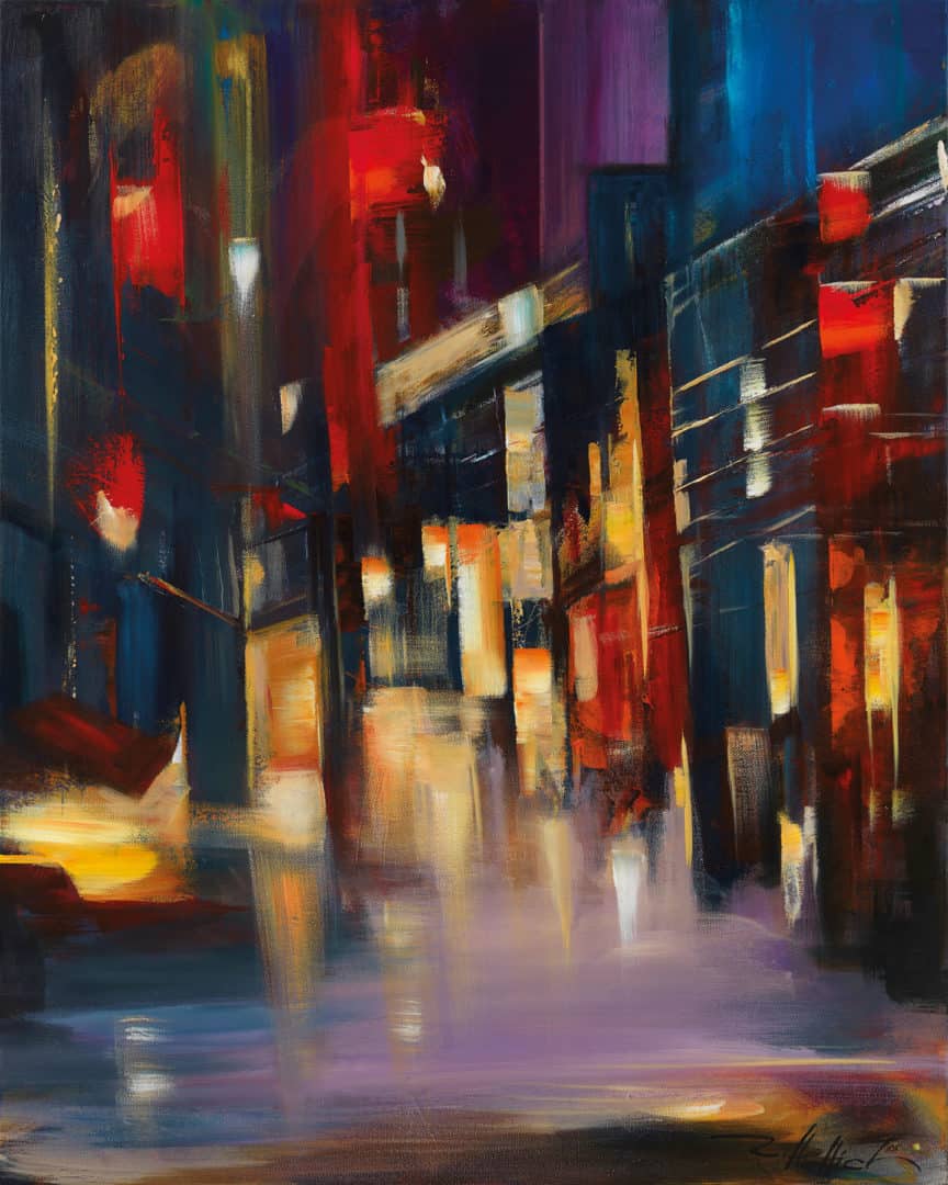Hettichs Playground ist eine Spielfläche im Doppelsinn: Die flache Leinwand bildet mit ihren zumeist geometrischen Farbflächen eine Welt, die das Gehirn des Betrachters mühelos als dreidimensionale Straßenszene entschlüsselt.