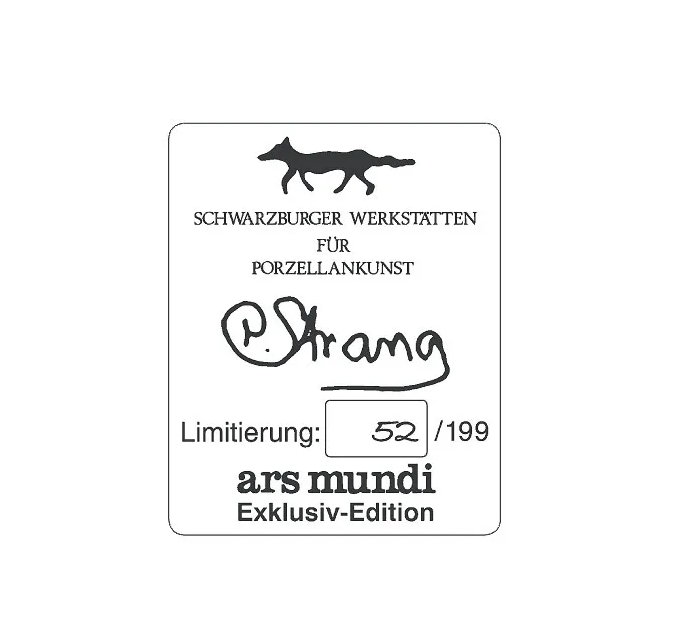 Limitiert auf 199 Exemplare. Durch die aufwendige Handbemalung sind kleinere Abweichungen in der Ausführung unausweichlich. Format der Porzellanskulptur 14 x 18 x 8 cm (B/H/T).