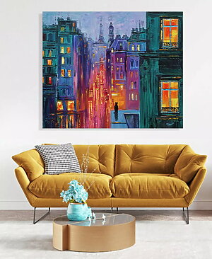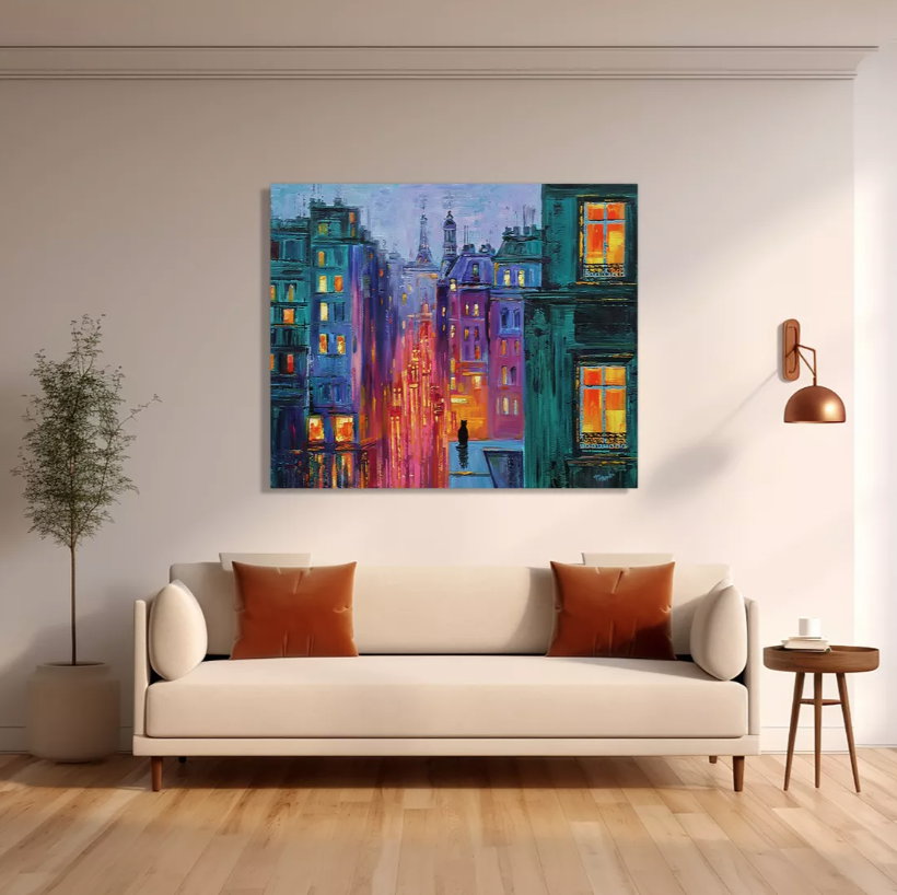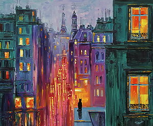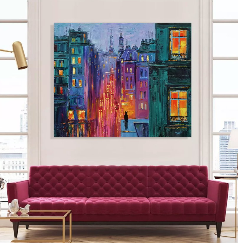 “City Cat and Night Lights” (2025) – Urban Art Gemälde von Trayko Popov, Acryl auf Leinwand