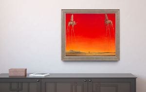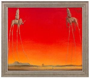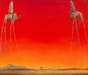 Die mächtigen Dickhäuter in „Les Éléphants“ sind ebenso wie die Obelisken, die sie auf dem Rücken tragen, Ausdruck pharaonischer, absoluter Staatsmacht. Auf lang gestreckten Beinen ragen sie bis zum Himmel empor, der vom Sonnenuntergang rot gefärbt ist, sie haben den Bodenkontakt nahezu verloren. Die Mächte kommen von verschiedenen Seiten, doch gleichen sie einander bis ins Detail: Zu Stein erstarrt und leicht verstaubt bröckelt die Allmacht bereits. Das wahre Leben spielt sich auf dem Boden ab: Ein Engel begegnet dem Menschen zu Fuß auf seinem Weg zum Horizont.
