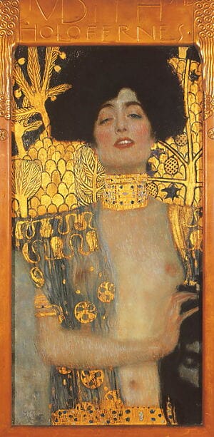 Das Alte Testament erzählt die Geschichte von der schönen und gottesfürchtigen Witwe Judith, die unbewaffnet in das Heerlager des nebukadnezaischen Generals Holofernes geht und ihn mit seinem eigenen Schwert enthauptet – ein beliebtes Motiv in der Kunstgeschichte. Klimts berühmte “Goldene Judith” ist eine moderne “Femme fatale”, die mit ihren Reizen so manchen Mann den Kopf kosten könnte..