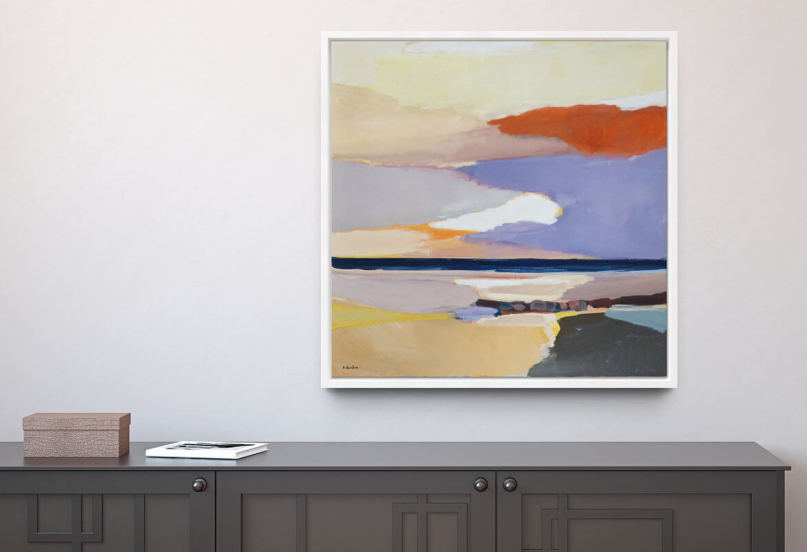Gerahmt in weißer Massivholzleiste mit Schattenfuge. Format 100 x 100 cm.